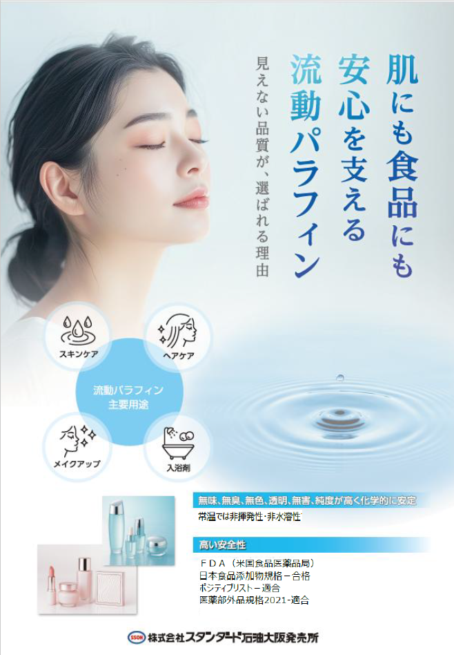| 特徴 | ■流動パラフィンとはミネラルオイルとも呼ばれ、石油を高度蒸留精製して得られる無臭、無色透明のオイルです。原料となる石油の潤滑油留分に含まれている芳香族炭化水素や硫黄化合物などの不純物を除去し、高度に精製しているため、流動パラフィンは純粋な炭化水素といえます。常温では非揮発性、非水溶性で、通常の使用条件では酸化されず、経時変色もありません。 ★ 製品の特徴 ★ 1,無味、無臭、無色、透明、無害、純度が高く化学的に安定(常温では非揮発性、非水溶性) 2,紫外吸収度が高く、日光、熱、安定性に優れる 3,安全性 FDA(米国食品医薬品局)21CFR172.878 for direct use in food、日本食品添加物規格-合格、ポジティブリスト-適合、医薬部外品規格2021-適合 |